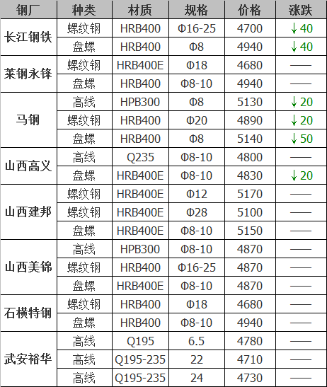 1月18日長信廢鋼部分下調20元:剪切料3350、拆車件3450、混料3520、一級料3550、準一級3570、重廢3590、鋼板鋼件3610、二級破碎3320、一級破碎3470、鋼板破碎3500、特級破碎3530-3550。