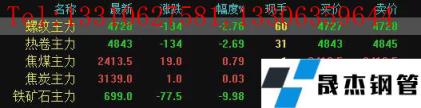 今日螺紋主力期貨跌134,收報4728,跌幅2.76%;熱卷主力跌134,收報4843,跌幅2.69%;焦煤主力漲19,收報2413.5,漲幅0.79%;焦炭主力漲1,收報3139,漲幅0.03%;鐵礦石主力跌77.5,收報699,跌幅9.98%。