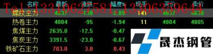 今日螺紋主力期貨跌138,收?qǐng)?bào)4637,跌幅2.89%;熱卷主力跌95,收?qǐng)?bào)4804,跌幅1.94%;焦煤主力跌12.5,收?qǐng)?bào)2635,跌幅0.47%;焦炭主力跌23,收?qǐng)?bào)3391.5,跌幅0.67%;鐵礦石主力漲3,收?qǐng)?bào)703,漲幅0.43%。