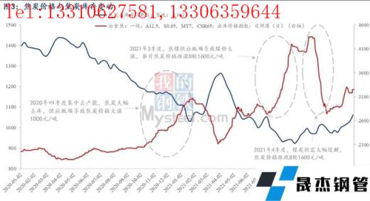 2)而2021年雖沒有再出現(xiàn)2020年4季度集中大幅去產(chǎn)能的情況。但仍出現(xiàn)了2021年三季度焦炭價格大漲1600元/噸的情形,兩個半月漲幅48%,漲幅明顯高于2020年四季度。這主要是由于焦煤供應受限導致的煤價大漲推升焦炭成本大幅上漲,以呂梁低硫主焦煤來看,其價格從6月底至9月底漲了一倍(2050-4100元/噸),焦炭供應矛盾從產(chǎn)能約束轉(zhuǎn)移至原料供應受限。同樣的,2021年四季度后,國家出臺煤炭保供政策,原料供應大幅緩解,同時需求端鐵水產(chǎn)量大減,最終傳導至焦煤價格大跌,焦炭價格應聲回落1600元/噸。