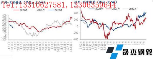 1月份廣州、杭州市場(chǎng)市場(chǎng)價(jià)格漲幅緩慢,北京市場(chǎng)價(jià)格漲幅居前,因此廣州-北京、杭州-北京市場(chǎng)的區(qū)域價(jià)差均有所收窄。目前廣州-北京價(jià)差在300元/噸左右,此價(jià)差略低于2020年、2021年同期水平,且結(jié)合無縫厚壁鋼管廠家的政策以及運(yùn)費(fèi)來看此價(jià)差也不足以吸引北方區(qū)域資源南下廣州。目前杭州-北京價(jià)差不足100元/噸,因北京價(jià)格相對(duì)高位,加之東北區(qū)域節(jié)后需求啟動(dòng)較晚,因此東北區(qū)域部分無縫厚壁鋼管廠家傾向于把資源投放至北京區(qū)域,其中西林、新?lián)徜撋踔劣诤v味加写税才拧?/p>