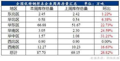 全國優(yōu)特鋼棒材樣本總庫存87.7萬噸,環(huán)比上升18.55萬噸,增幅26.82%。
