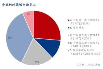 調研企業樣本中,對于全面復工的時間,節后第一周(2022年2月7日~2月13日)占比26.37%,節后第二周(2022年2月14日~2月20日)占比36.32%,節后第三周(2022年2月21日~2月27日)占比19.40%,節后第四周或以后(2022年2月28日及以后)占比6.47%,暫未確定占比11.44%。