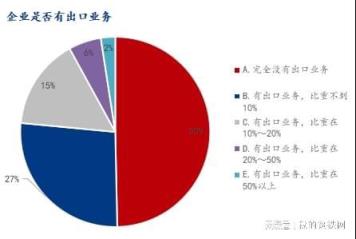 參與調研企業中,49.67%企業表示完全沒有出口業務,50.33%企業有出口業務,具體看有出口業務,比重不到10%占比26.83%;有出口業務,比重在10%~20%占比15.52%;有出口業務,比重在20%~50%占比5.54%;有出口業務,比重在50%以上占比2.44%。