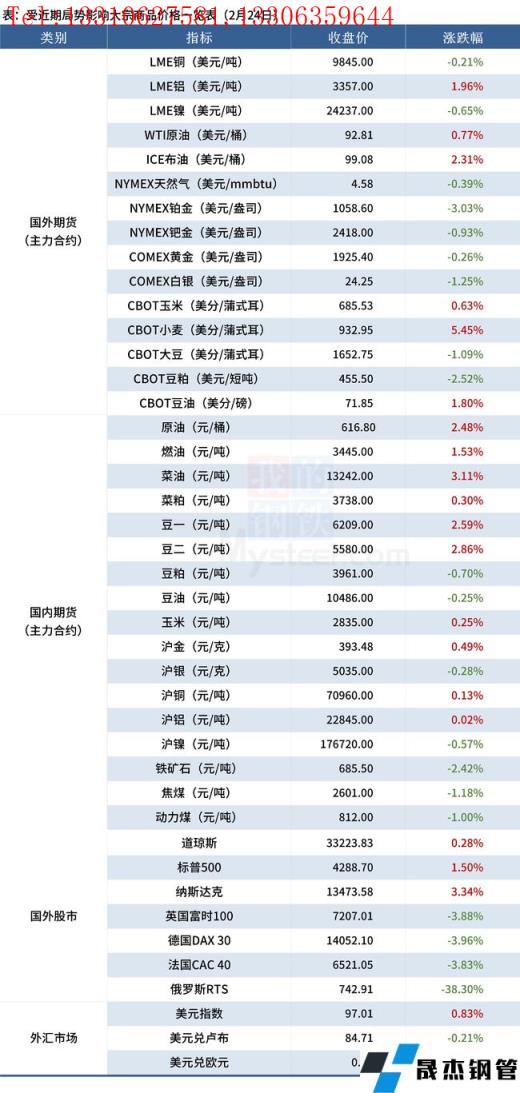 免責聲明:本網站(山東聊城晟杰無縫鋼管廠m.hccoo.com)刊載的“受近期局勢影響大宗商品價格一覽表(2月24日)”等均源于網絡,版權歸原作者所有,且僅代表原作者觀點,本文所載信息僅供參考。轉載僅為學習與交流之目的,如無意中侵犯您的合法權益,請及時聯系刪除。本網站刊登此篇文章并不意味著本站贊同其觀點或證實其內容的真實性,我們不對其科學性、嚴肅性等作任何形式的保證。如果侵犯了您的版權,請盡快聯系我們予以撤銷,謝謝合作!