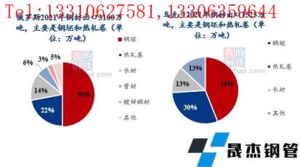 俄、烏均是產鋼大國和厚壁無縫鋼管主要出口國,兩國主要出口產品均為鋼坯、熱軋卷、長材。據世界鋼協統計,2021年,俄、烏粗鋼產量分別為7600萬噸和2140萬噸,產量在全球排名第五和第十四位,分別占全球粗鋼總產量的3.9%和1.1%。