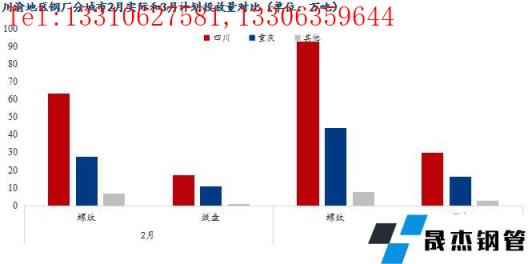 2、3月份川渝地區(qū)建筑厚壁無縫鋼管生產(chǎn)企業(yè)對四川市場計劃投放122.57萬噸,環(huán)比增加51.92%;對重慶市場計劃投放60.5萬噸,環(huán)比增加56.74%;對云南、貴州等地計劃放10.6萬噸,環(huán)比增加33.17%。