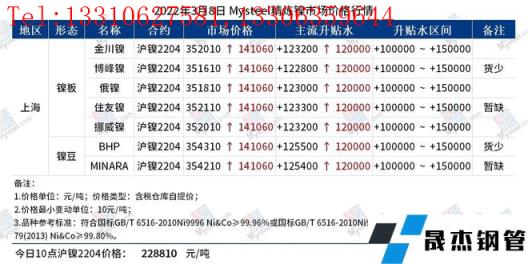 免責聲明:本網站(山東聊城晟杰無縫鋼管廠m.hccoo.com)刊載的“鎳產業鏈價格(2022.3.8)”等均源于網絡,版權歸原作者所有,且僅代表原作者觀點,本文所載信息僅供參考。轉載僅為學習與交流之目的,如無意中侵犯您的合法權益,請及時聯系刪除。本網站刊登此篇文章并不意味著本站贊同其觀點或證實其內容的真實性,我們不對其科學性、嚴肅性等作任何形式的保證。如果侵犯了您的版權,請盡快聯系我們予以撤銷,謝謝合作!