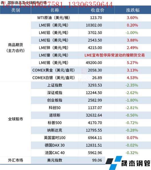 免責聲明:本網站(山東聊城晟杰無縫鋼管廠m.hccoo.com)刊載的“2022年03月09日早讀:LME緊急切斷鎳期貨交易,美宣布禁止進口俄羅斯石油”等均源于網絡,版權歸原作者所有,且僅代表原作者觀點,本文所載信息僅供參考。轉載僅為學習與交流之目的,如無意中侵犯您的合法權益,請及時聯系刪除。本網站刊登此篇文章并不意味著本站贊同其觀點或證實其內容的真實性,我們不對其科學性、嚴肅性等作任何形式的保證。如果侵犯了您的版權,請盡快聯系我們予以撤銷,謝謝合作!