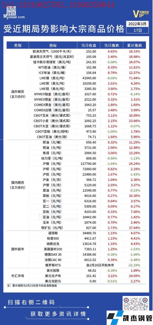 近期,受國際局勢影響,全球金融及大宗商品市場出現較大波動。3月17日,國際油價大幅反彈。匯總情況如下: