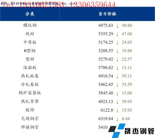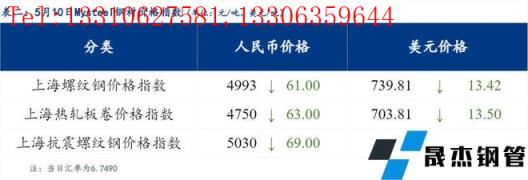 5月10日普鋼絕對價格指數(shù)變化:綜合指數(shù)5177.26,下跌43.86;螺紋鋼指數(shù)4975.63,下跌49.88;線材指數(shù)5355.29,下跌47.08;熱軋板卷指數(shù)4916.54,下跌59.11;冷軋板卷指數(shù)5462.65,下跌35.59;中厚板指數(shù)5174.25,下跌24.65。