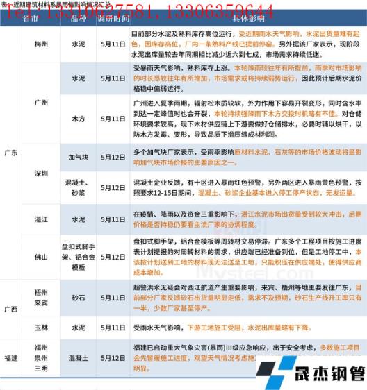 截至5月12日,據百年建筑網調研,3省建材市場和建筑工地進度受到明顯影響。本次降雨是今年以來廣東遭遇強度最強、范圍最廣、持續時間最長的強降水過程,城鄉積澇和地質災害風險極高,嚴重影響水泥企業出庫。目前降雨情況來看,多數施工項目會先暫緩施工進度,觀望天氣情況再考慮施工的進行。具體情況如下: