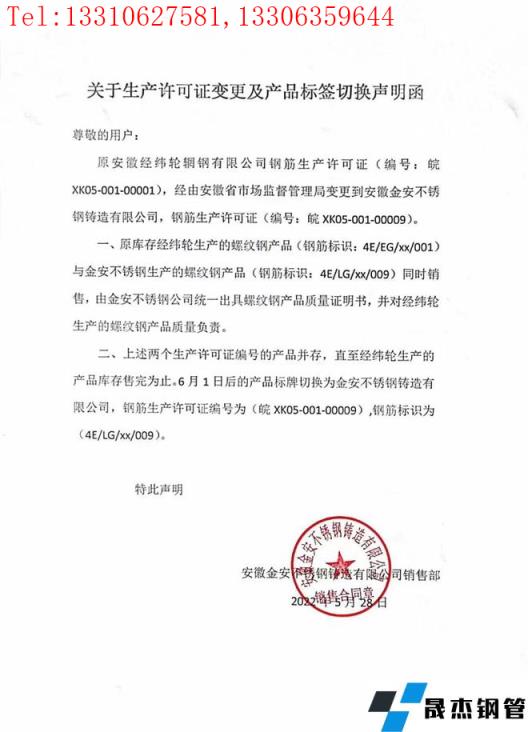 二、上述兩個生產(chǎn)許可證編號的產(chǎn)品并存,直至經(jīng)緯輪生產(chǎn)的產(chǎn)品庫存售完為止。6月1日后的產(chǎn)品標(biāo)牌切換為金安不銹鋼鑄造有限公司,鋼筋生產(chǎn)許可證編號為(皖XK05-001-00009),鋼筋標(biāo)識為(4E/LG/xx/009)。