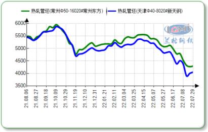 7月末,北方地區(qū)無縫鋼管廠家20#熱軋管坯出廠報價4050-4240元,20#連鑄出廠報價3940-4150元;南方地區(qū)20#熱軋出廠報價4240-4570元,北方新天鋼、南方東方兩家無縫鋼管廠家熱軋管坯價差維持在190元左右,較7月中旬相比兩者價差有所收窄。受美聯(lián)儲加息預期及國內(nèi)需求持續(xù)低迷影響,管坯價格大幅下跌,北方地區(qū)熱軋管坯價格跌至3970元,創(chuàng)近一年以來的新低,不過在7月27日筑底后管坯價格呈現(xiàn)小幅上揚走勢。